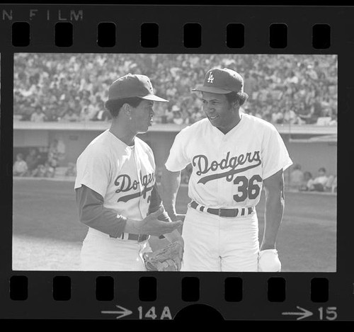 Above is a 1972 photograph of Frank Robinson with Dodger speedster Maury Wills. It comes from the Los Angeles Times Photographic Archives at UCLA and was taken by Bill Varie (link here).