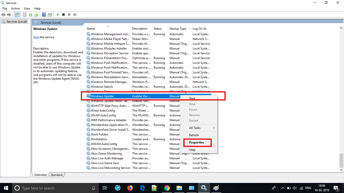 STEP NO-2अब आपकी SERVICES इसकी सेटिंग ओपन हो चुकी है आप किसी OPTION पर क्लिक करें और अपने कीबोर्ड में W टाइप करें आप जैसे ही W टाइप करेंगे तो आपको सारे W वाले ऑप्शन दिखाई देने लगेंगे अब आपको इसमें WINDOWS UPDATE का ऑप्शन ढूंढने हैं तो आपको जैसे ही विंडोज अपडेट का ऑप्शन दिखेगा आप उस पर क्लिक करे और MOUSE का RIGHT OPTION बटन पर क्लिक करें और आपको PROPERTIES वाले ऑप्शन पर क्लिक कर देना है