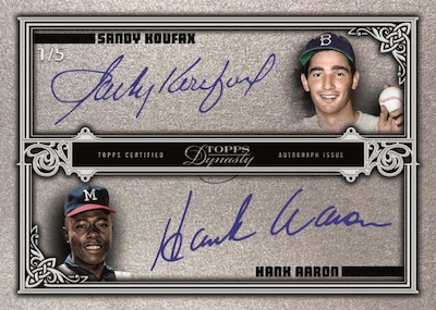 - The Cardboard Connection shares a bunch of preview pics of Topps upcoming 2019 Dynasty Baseball card brand -- slated for release on November 6th. Check out the duel Sandy Koufax/Hank Aaron card on the right.