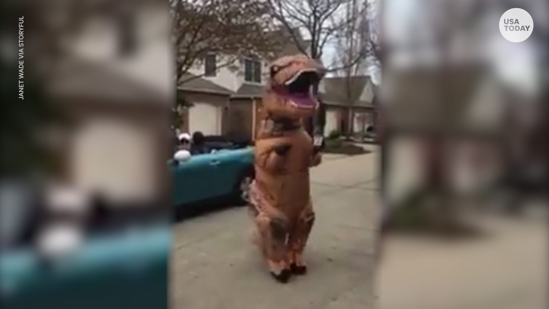 Cathy Tasse dresses as a T-Rex every week to deliver wine around Cleveland, Ohio to those making a positive difference during the COVID-19 pandemic.