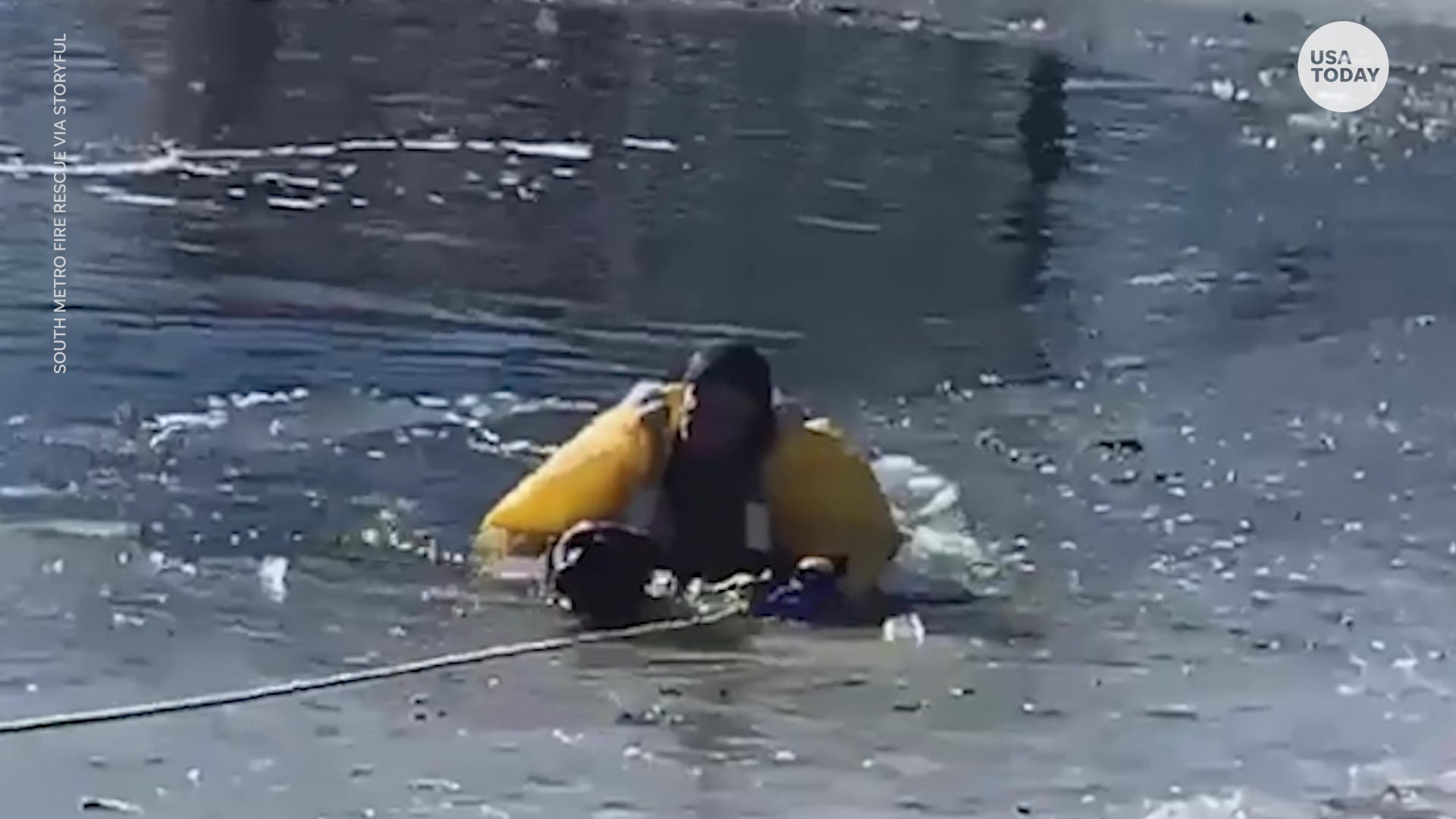 Firefighters came to the rescue after this dog fell through the ice on a frozen pond in Littleton, Colorado.