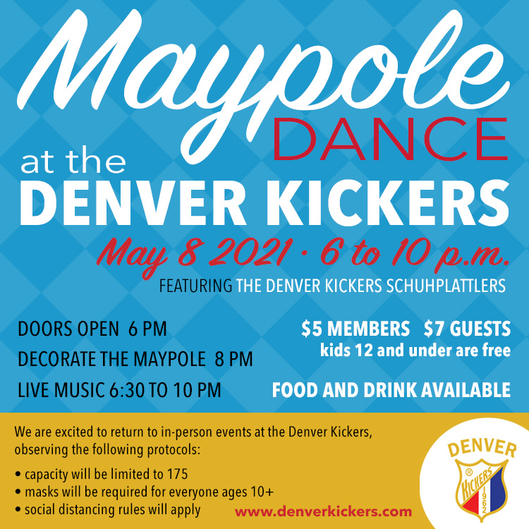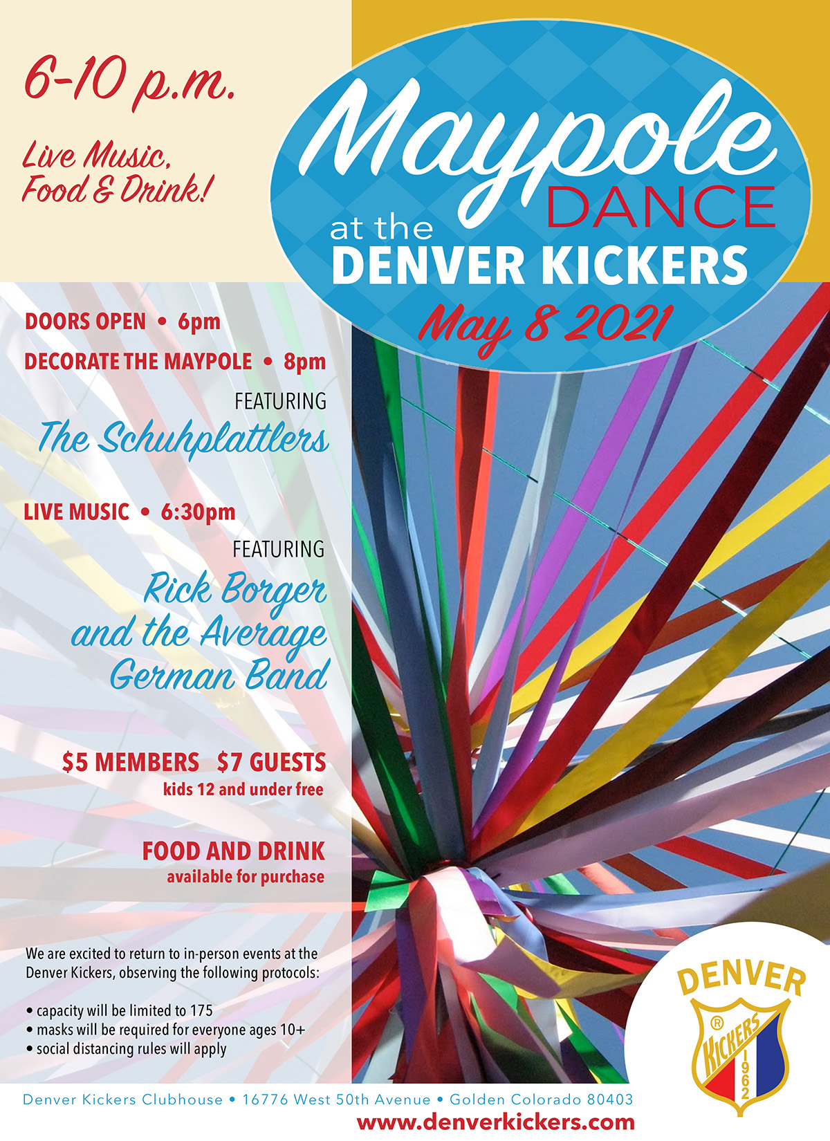 With the recent changes to the COVID mandates issued by Jefferson County Public Health and the State, the Denver Kickers is pleased to announce an in-person event on Saturday, May 8 from 6-10 p.m. Please join us for our annual Maypole Dance, celebrating the club’s Bavarian roots through traditional dance, food and beverage. The Denver Kickers Schuhplattlers will perform several dances, and the event will feature music by Rick Borger and the Average German Band. Doors open at 6 p.m., live music starts at 6:30 p.m,, and we’ll decorate the Maypole at 8 p.m. Cost is $5 for members, $7 for guests, and kids ages 12 and under are free.