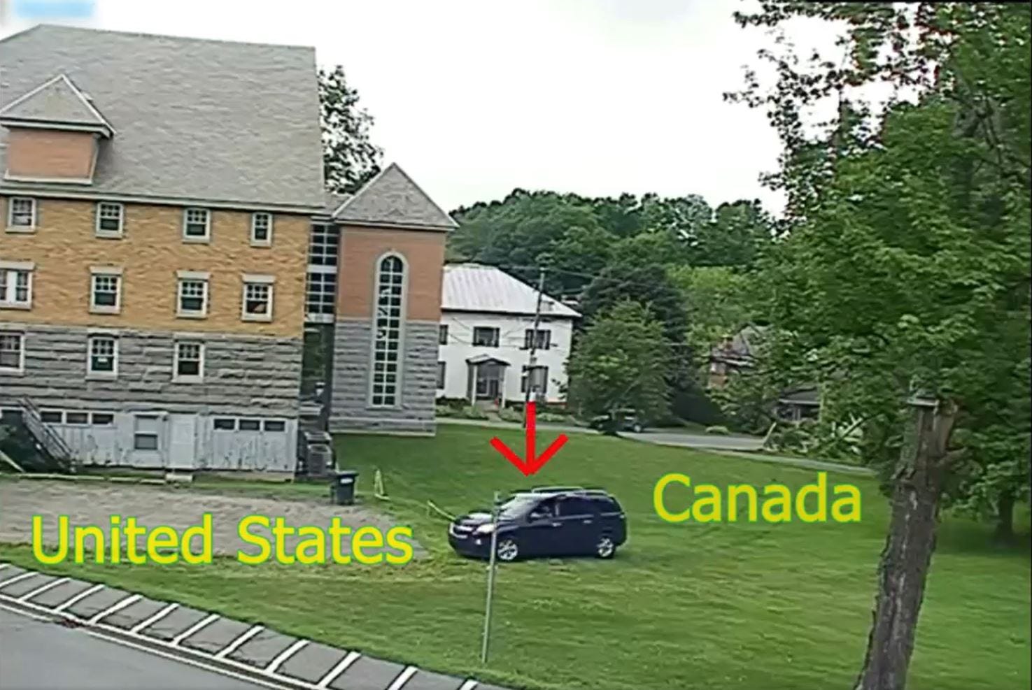 Seven people apprehended after entering Vermont illegally from Quebec by driving across the lawn of a library built in both the United States and Canada.