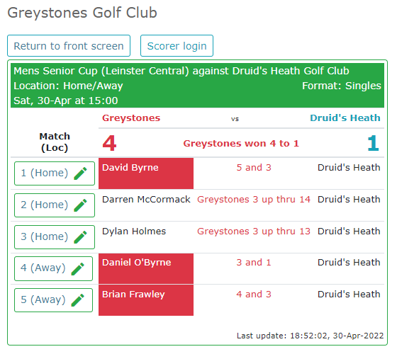 Congratulations to our Senior Cup team who had a reasonably comfortable win in the end over Druid’s Heath this afternoon. While we had three matches at home both Daniel O’Byrne and Brian Frawley finished their away matches before any of the home matches were completed. David Byrne then won our first match out at home to seal the victory. Darren McCormack & Dylan Holmes were each 3 up in their matches when called in.