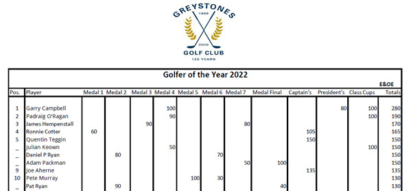 Well done to Garry Campbell who was crowned Golfer of the Year 2022 yesterday after the last qualifying event of the calendar. Garry won Medal 4, was a semi-finalist in President Neville Galloway’s Prize and won his Class Cup to score a 280 points total. Padraig O’Regan was the only player who could have caught Garry yesterday but in the end it was Garry who won out. Garry was 90 points ahead of Padraig at close of play with James Hempenstall another 20 points behind in third. Ronnie Cotter, who had lead the GOTY table for a good number of weeks finished a very creditable fourth just 5 points behind James. In joint fifth place were, Captain’s Prize winner Quentin Teggin, Scratch Cup winner Adam Packman, Daniel P. Ryan and Julian Keown. Joe Aherne finished ninth with Pete Murray and Pat Ryan rounding out the top ten. Another close finish this year, many congratulations to Garry on a fine year’s golfing.