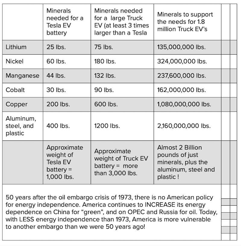 Here is a summary of the minerals needed for a Tesla EV battery and the projected humongous needs of the minerals to support 1.8 million Diesel Truck EV’s: