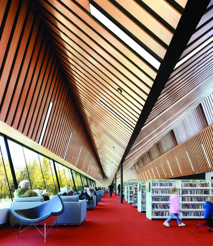 In a move recalling the light monitors of Aalto’s libraries, strips of west-facing windows are located along two roof peaks to capture the low winter sun. The wooden screen filter creates a spectacular display of light and shadow in the interior that evokes the qualities of Edmonton’s forests in the warm hues of autumn. Circular columns echo the dimensions of nearby trees, and a radiant red carpet grounds the interior like the dogwood underbrush of the ravine, reinforcing the library’s warm embrace.