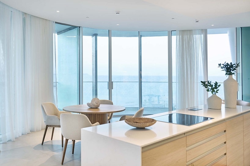 The East Tower features 95 spacious luxury apartments, ranging from a mix of one-, two-, three- or four-bedroom residences, as well as full-floor penthouse apartments at the top two floors, which offer 360-degree views. They were constructed to ensure all living spaces, including bedrooms, are oriented toward the water and nearby beaches.
