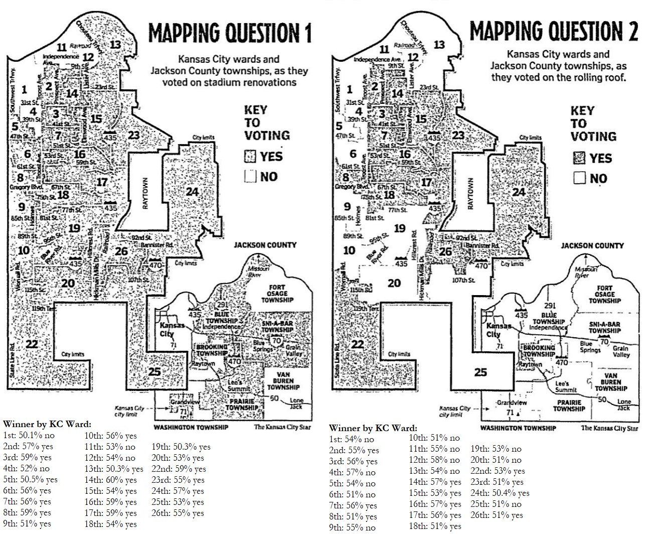 Question 1 (Stadium Renovations) won in 21 of 25 Kansas City Wards. Losing only in Ward 1 (Downtown), Ward 4 (next to Downtown), and Ward 11/12 (Northeast). The highest Yes votes were Ward 3 (a little more Eastern), Ward 9 (Brookside), Ward 14 (Eastern/Northeastern), Wards 16/17 (Eastern KC), and Ward 22 (In-between Grandview and Kansas). As for the rest of the county, it passed everywhere else in Jackson County except the rural Fort Osage and Van Buren Townships in the Northeastern and Southeastern corners of Jackson County.
