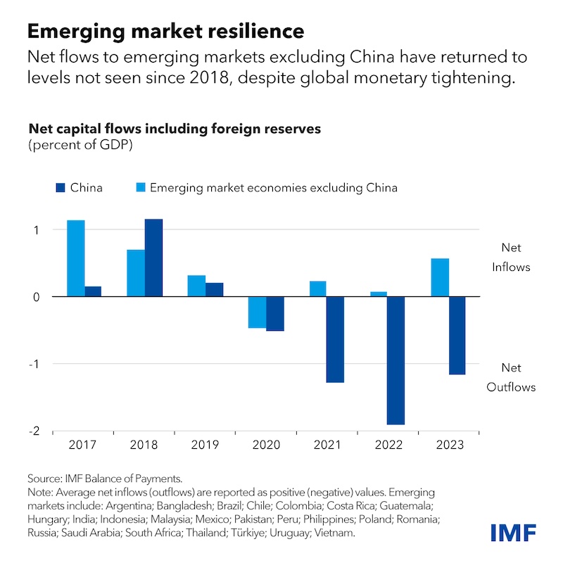 Our latest External Sector Report shows that capital flows into emerging markets have recovered from a post-pandemic low. Net capital inflows into emerging markets—excluding China—rose to $110 billion, or 0.6 percent of GDP, last year. That’s the highest level since 2018.