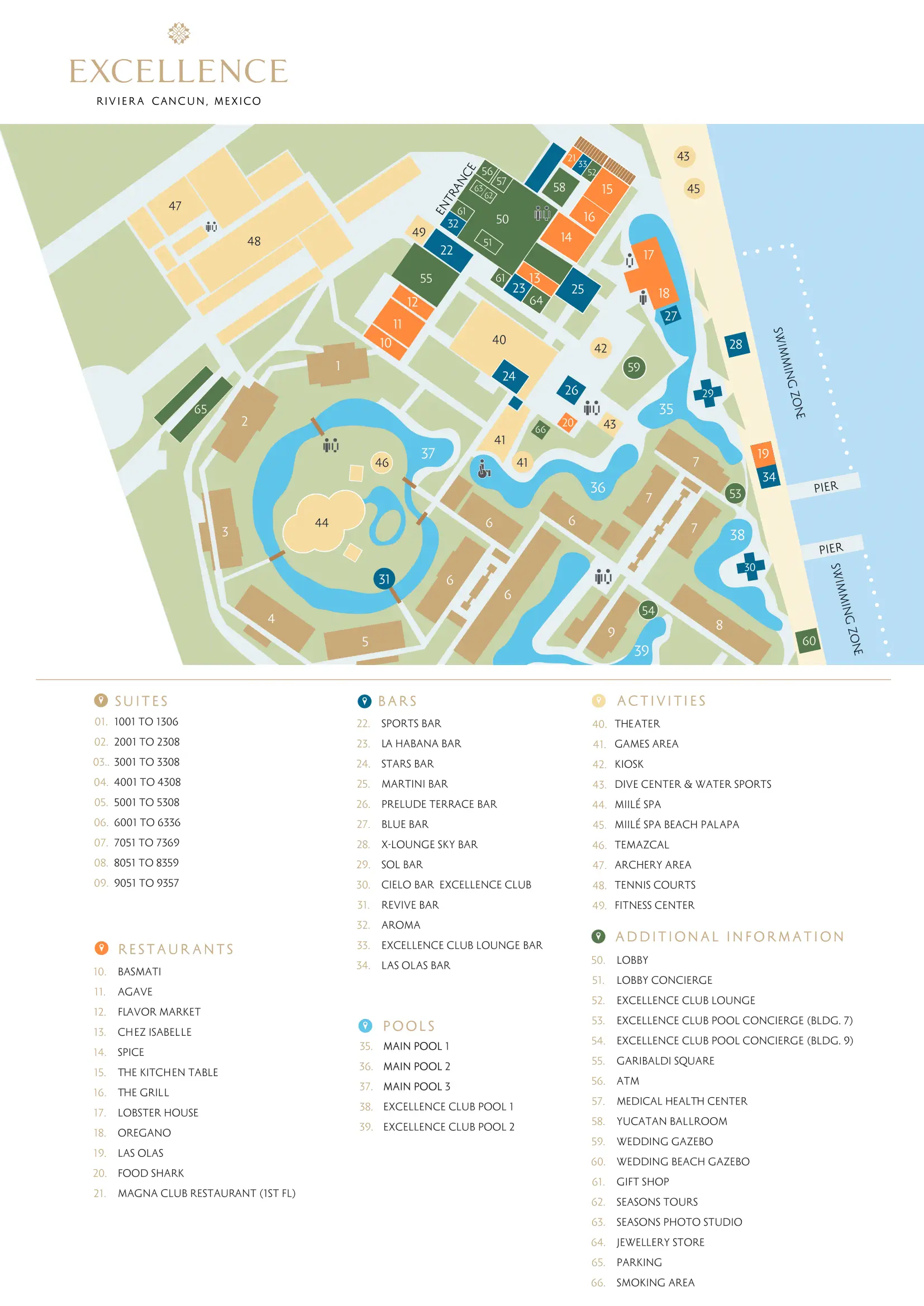 Discover the Excellence Riviera Cancun like a local. This detailed map reveals hidden gems. Find your way to the luxurious Excellence Club Lounge, the serene Spa Milenio, or the lively Sports Bar with ease.