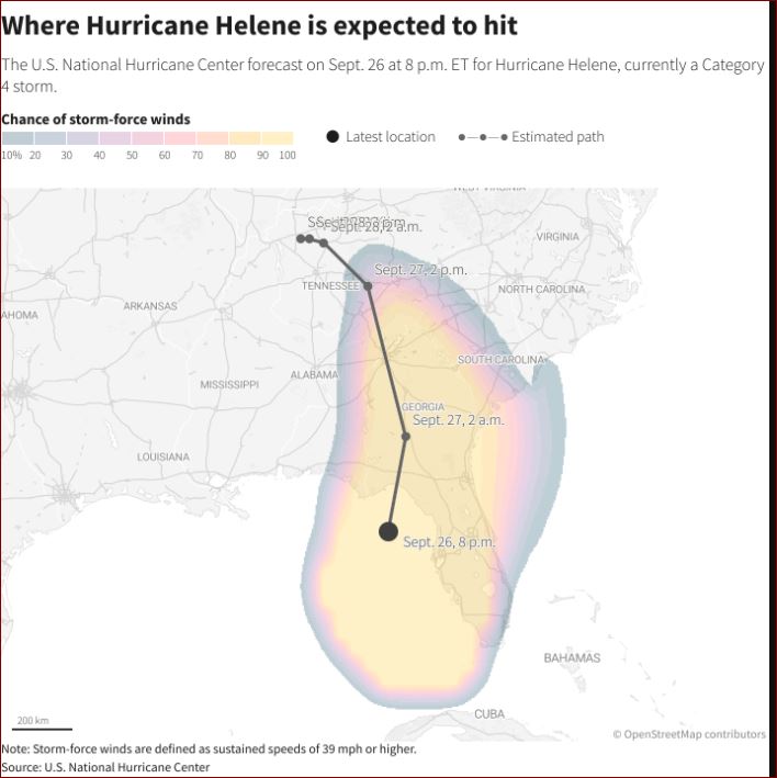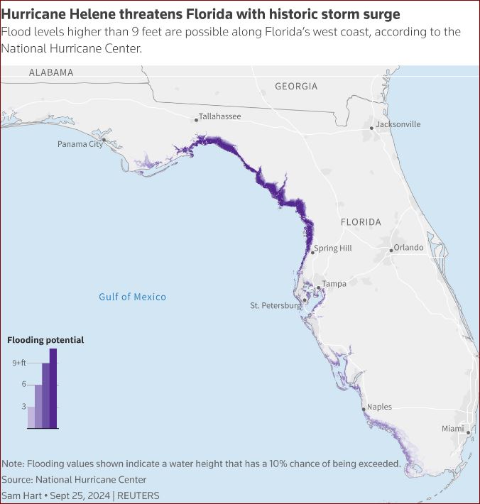 Officials pleaded with residents in the path of the storm to heed mandatory evacuation orders or face life-threatening conditions. Helene’s surge – the wall of seawater pushed on land by hurricane-force winds – could rise to as much as 20 feet (6.1 meters) in some spots, as tall as a two-story house, the center’s director, Michael Brennan, said in a video briefing.