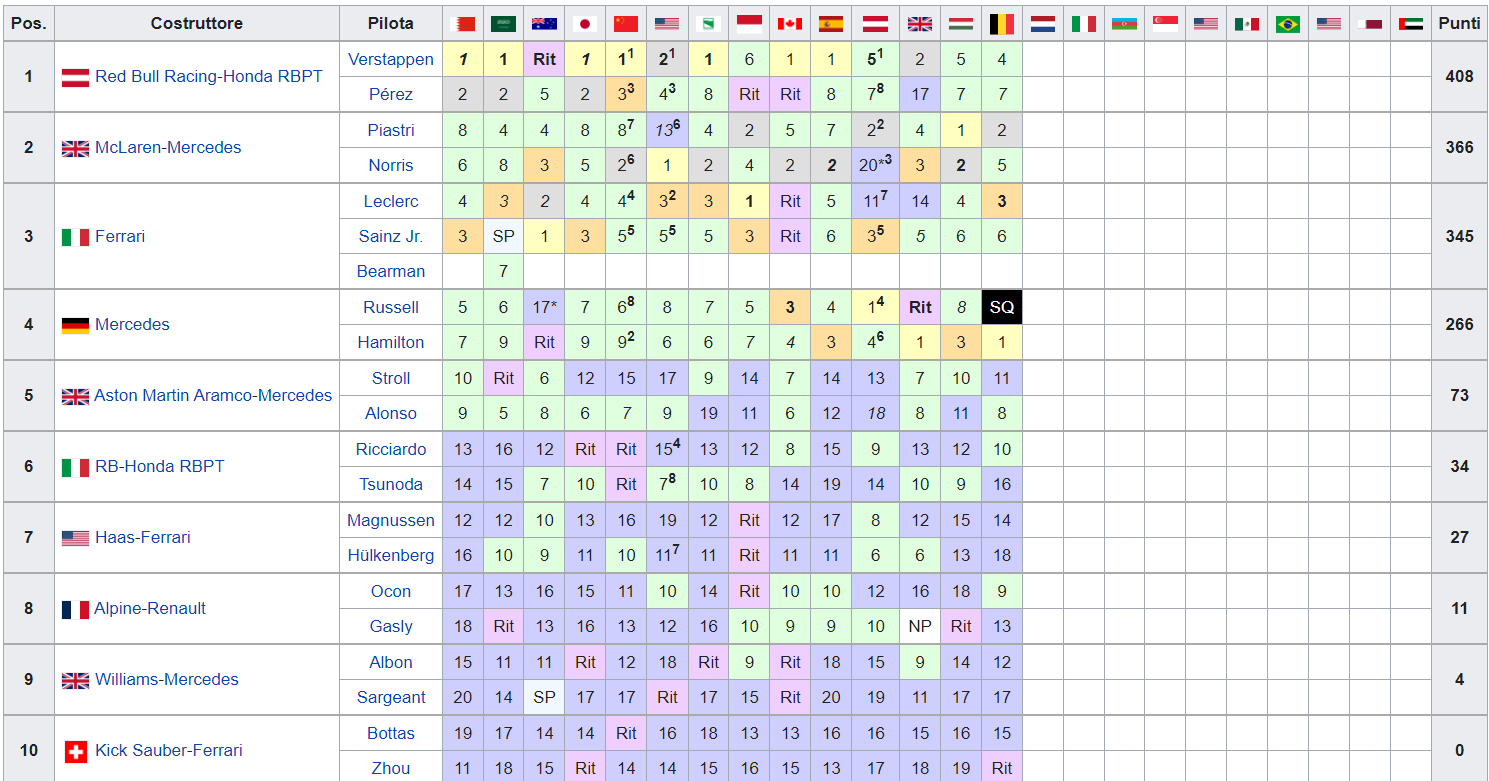 CLASSIFICA PILOTI F1 2024, dopo la gara in Belgio 1 M. Verstappen Red Bull 277 2 L. Norris McLaren 199 3 C. Leclerc Ferrari 177 4 O. Piastri McLaren 167 5 C. Sainz Ferrari 162 6 L. Hamilton Mercedes 150 7 S. Perez Red Bull 131 8 G. Russell Mercedes 116 9 F. Alonso Aston Martin 49 10 L. Stroll Aston Martin 24 11 N. Hulkenberg Haas 22 12 Y. Tsunoda RB 22 13 D. Ricciardo RB 12 14 O. Bearman Ferrari 6 15 P. Gasly Alpine 6 16 K. Magnussen Haas 5 17 E. Ocon Alpine 5 18 A. Albon Williams 4 19 V. Bottas Kick Sauber 0 20 G. Zhou Kick Sauber 0 21 L. Sargeant Williams 0 CLASSIFICA COSTRUTTORI F1 2024, dopo la gara in Belgio 1 Red Bull 408 2 McLaren 366 3 Ferrari 345 4 Mercedes 266 5 Aston Martin 73 6 RB 34 7 Haas 27 8 Alpine 11 9 Williams 4 10 Kick Sauber 0