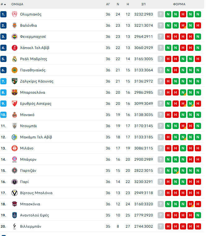 Ο Ολυμπιακός εντυπωσίασε, επικρατώντας της Ρεάλ Μαδρίτης και διατηρήθηκε στην κορυφή της βαθμολογίας με ρεκόρ 24-12. Την ίδια ώρα, ο Παναθηναϊκός ήταν καταιγιστικός απέναντι στην Μπαρτσελόνα, ανεβάζοντας το ρεκόρ του στο 21-15. Έτσι, οι Πειραιώτες βρίσκονται στην πρώτη θέση, ενώ η ομάδα του Εργκίν Αταμάν στην 6η.