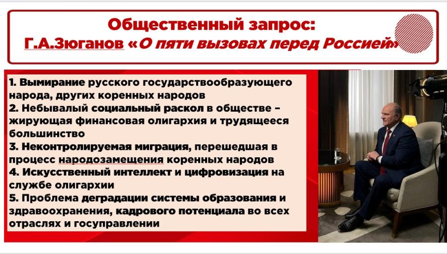 Лидер КПРФ Г.А. Зюганов так сформулировал пять критических вызовов, которые стоят перед Россией.
