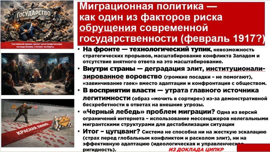 Полагаю, что неэффективная миграционная политика может спровоцировать «черного лебедя», как это уже мы видели на примере трагедии с массовым терактом в «Крокус-сити». Полагаю, что здесь также один из факторов риска обрушения современной государственности по типу февраля 1917 или декабря 1991 года. Наш Центр исследований политической культуры России проанализировал алармистские оценки экспертов по этому поводу и опубликовал специальный аналитический доклад.