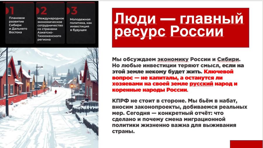 КПРФ не стоит в стороне — мы бьем в набат, вносим законопроекты, добиваемся принятия мер. И сегодня я готов отчитаться перед вами: что мы сделали, и почему изменение миграционной и демографической политики жизненно важно для выживания России.