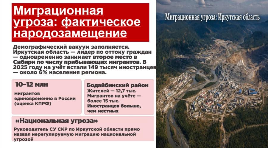 Вдумайтесь в цифры по Бодайбинскому району: постоянное население района — 12,7 тысячи человек, а на миграционный учет за год поставлено более 15 тысяч мигрантов! Иностранцев стало больше, чем местных жителей. Это уже не экономика, это классическое локальное народозамещение. Неудивительно, что руководитель Следственного управления СКР по Иркутской области прямо назвал нерегулируемую миграцию «национальной угрозой».