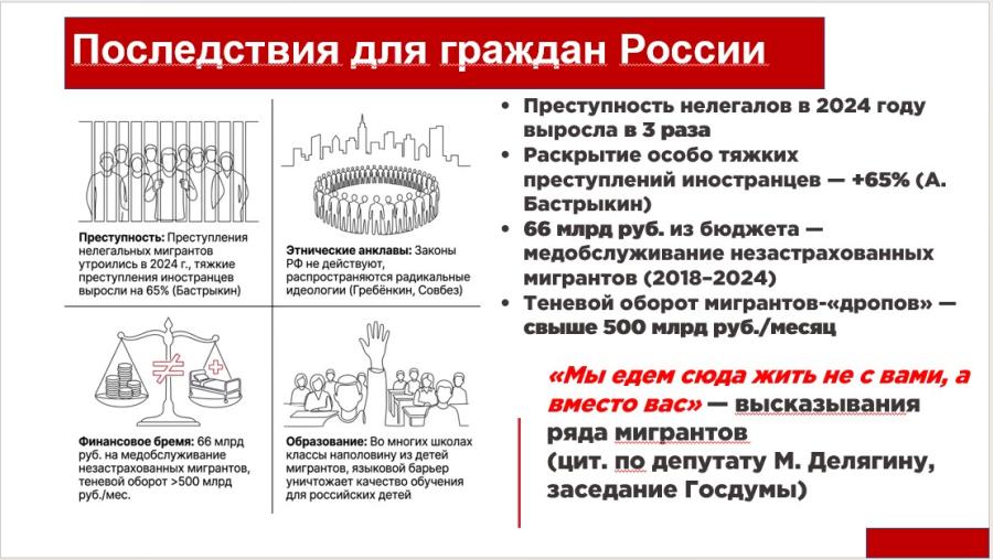 Третье — финансовое бремя и теневая экономика. С 2018 по 2024 год регионы потратили на медобслуживание незастрахованных мигрантов более 66 миллиардов рублей из кармана наших налогоплательщиков. А в теневой финансовой системе сегодня задействованы сотни тысяч мигрантов-«дропов» с оборотом свыше 500 миллиардов рублей в месяц. Это паразитирование на нашей экономике в особо крупном размере!