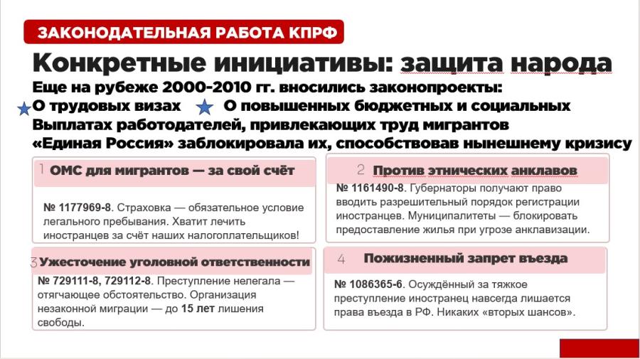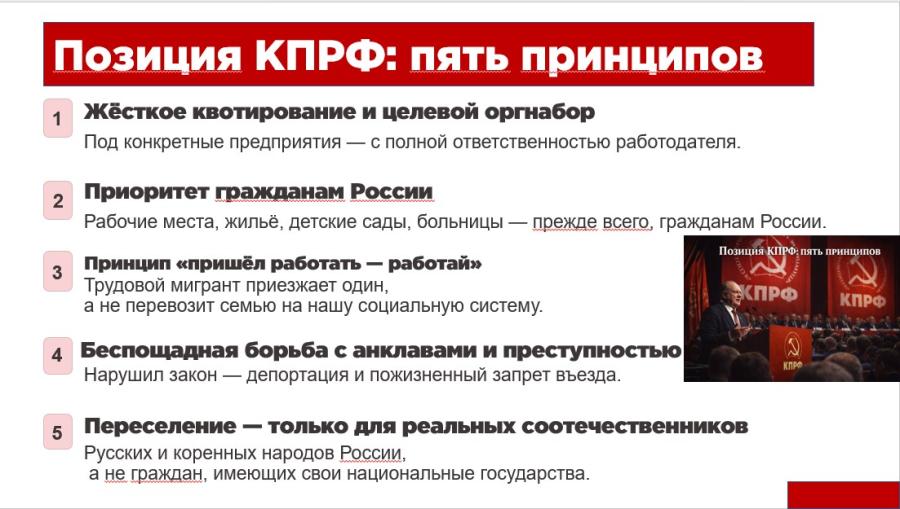 КПРФ будет продолжать эту борьбу. Мы будем добиваться визового режима, квотной системы и реальной ответственности капитала за миграционный беспредел.