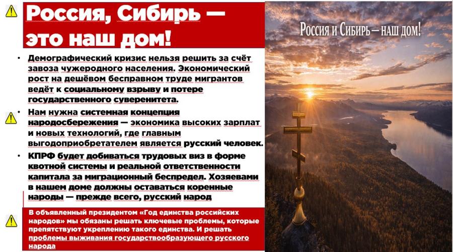 КПРФ выступает за системное решение демографического и миграционного вопроса. Мы не против людей труда. Мы против олигархической системы, которая ради сверхприбылей застройщиков и торгашей превращает Россию в страну для всех, кроме самих русских и других коренных россиян.