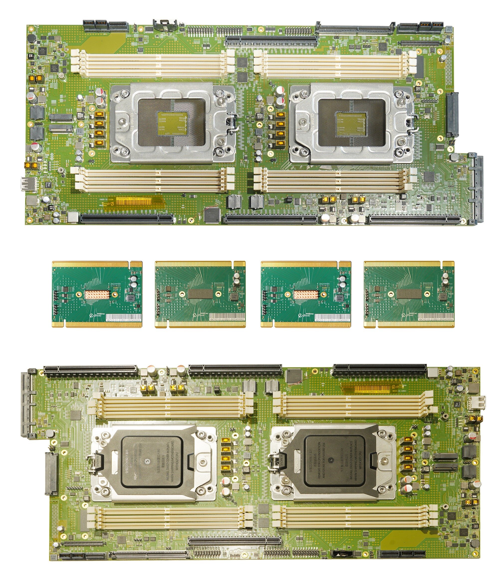 Размеры 20-слойной платы с высококачественным диалектриком весьма компактные — 44,6 × 20,3 см. Кроме того, у разработки есть несколько ключевых достоинств. Во-первых, благодаря использованию сателлитных плат, появляется возможность дополнительного межпроцессорного соединения, что приводит к повышению скорости обмена данными в два раза. Во-вторых, такая концепция позволяет создавать сборки четырехпроцессорного SMP конструктива из 2 типовых системных плат.