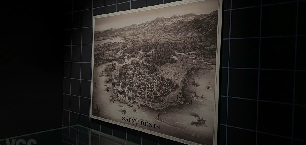 Отдельного внимания удостоился городок Сен-Дени. Рисунок выполнен в чёрно-белом варианте и демонстрирует вид на поселение с высоты птичьего полёта.