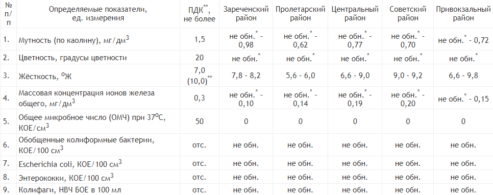 Самая чистая вода оказалась в Пролетарском округе. Там же она самая мягкая. Самая мутная – в Заречье, а наиболее жесткая вода зафиксирована в Центральном, Советском и Привокзальном округах.
