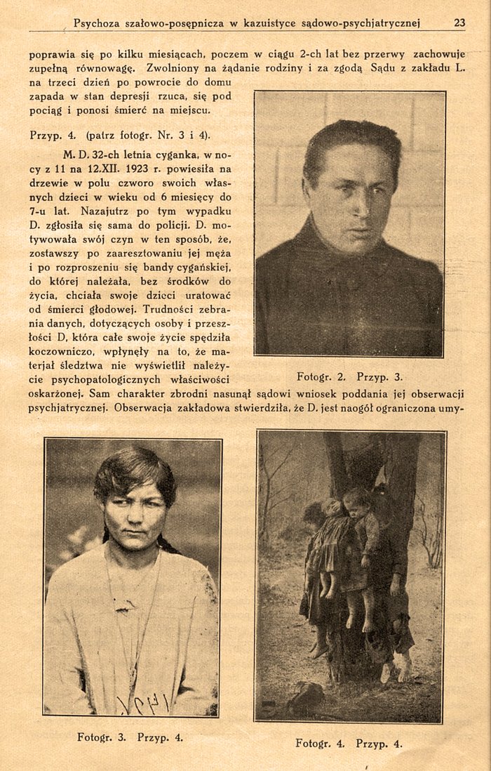 М. Д., 32–летняя цыганка, повесила своих четверых детей в возрасте от 6 месяцев до 7 лет на дереве в поле в ночь с 11 на 12 декабря 1923 года. На следующий день после этого инцидента Д. сама явилась в полицию. Д. оправдывала свой поступок тем, что, оставшись без гроша после ареста мужа и разгона цыганской банды, к которой она принадлежала, она хотела спасти своих детей от голодной смерти. Сложности со сбором данных о личности и прошлом Д., которая всю жизнь кочевала, привели к тому, что материалы расследования не смогли в полной мере пролить свет на психопатологические особенности обвиняемой. Сам характер преступления побудил суд запросить психиатрическую экспертизу. В ходе наблюдения в учреждении Д. была признана в целом умственно отсталой, находящейся в состоянии неглубокой депрессии, сочетающейся с апатией, заторможенностью, зрительными галлюцинациями и бредовыми убеждениями о том, что дьявол заставил её повесить своих детей и теперь строит планы собственной жизни. Д. была признана невменяемой и помещена в учреждение. Около года Д. находилась в учреждении в практически неизменённом состоянии. Безумный и мрачный характер её душевных страданий стал очевиден лишь с вспышкой типичного неистового возбуждения, которое началось в середине 1926 года и продолжается до сих пор, хотя и явно стихает. Не вызывает сомнений, что Д. совершила преступление, находясь в состоянии меланхолической депрессии, которая, однако, была недостаточно выражена в этот период и имела вид физиологической эмоциональной реакции. Преступление цыганки Д. представляло собой психопатологическую попытку затяжного самоубийства, которую пациентка не довела до конца.