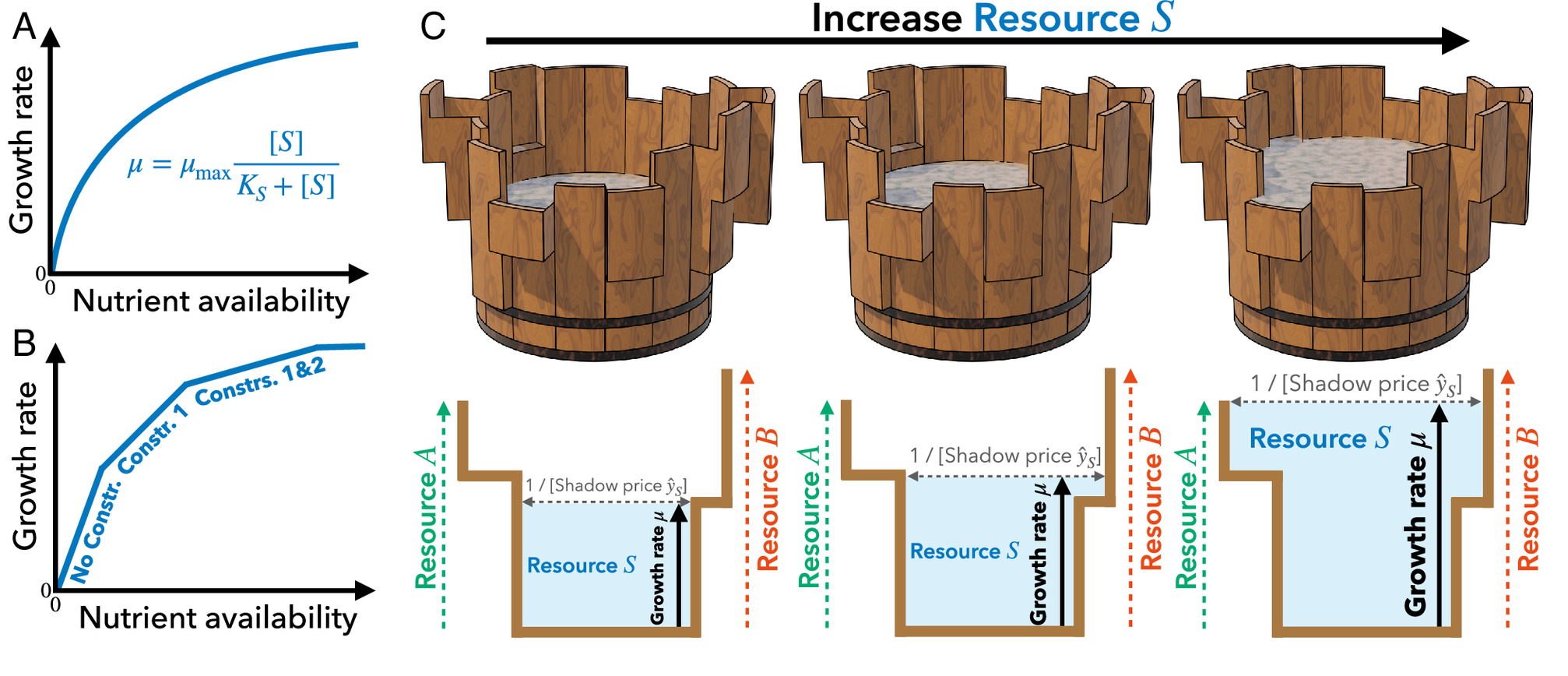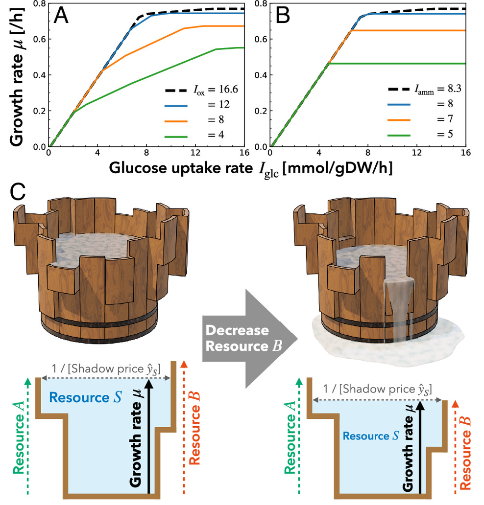 Самое сильное в этой работе — как она объединяет две классические идеи. Первая — это уже упомянутый закон Моно. Вторая — закон минимума Либиха, сформулированный еще в XIX веке для сельского хозяйства. Он гласит, что рост растения определяет тот элемент, которого меньше всего. Эту идею часто иллюстрируют образом бочки с досками разной высоты: воду можно налить лишь до уровня самой короткой доски.