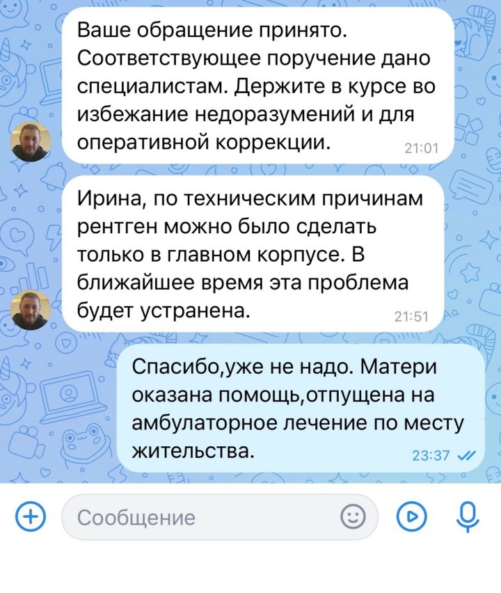 Глава Минздрава Карелии Михаил Охлопков сообщил горожанке, что по техническим причинам рентген действительно можно было сделать только в главном корпусе РБ СЭМП. К счастью, пневмония не подтвердилась, и женщина уехала лечиться домой.
