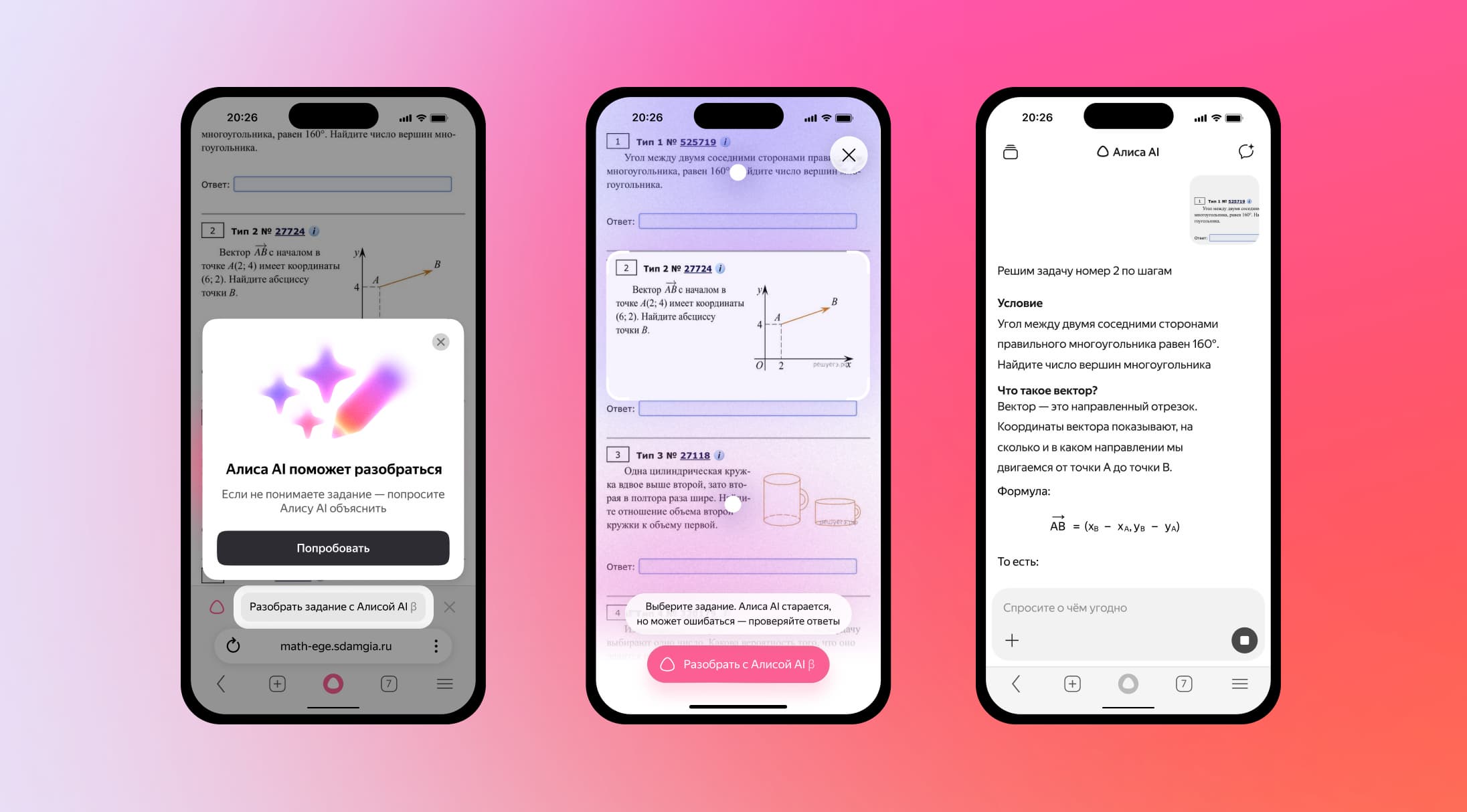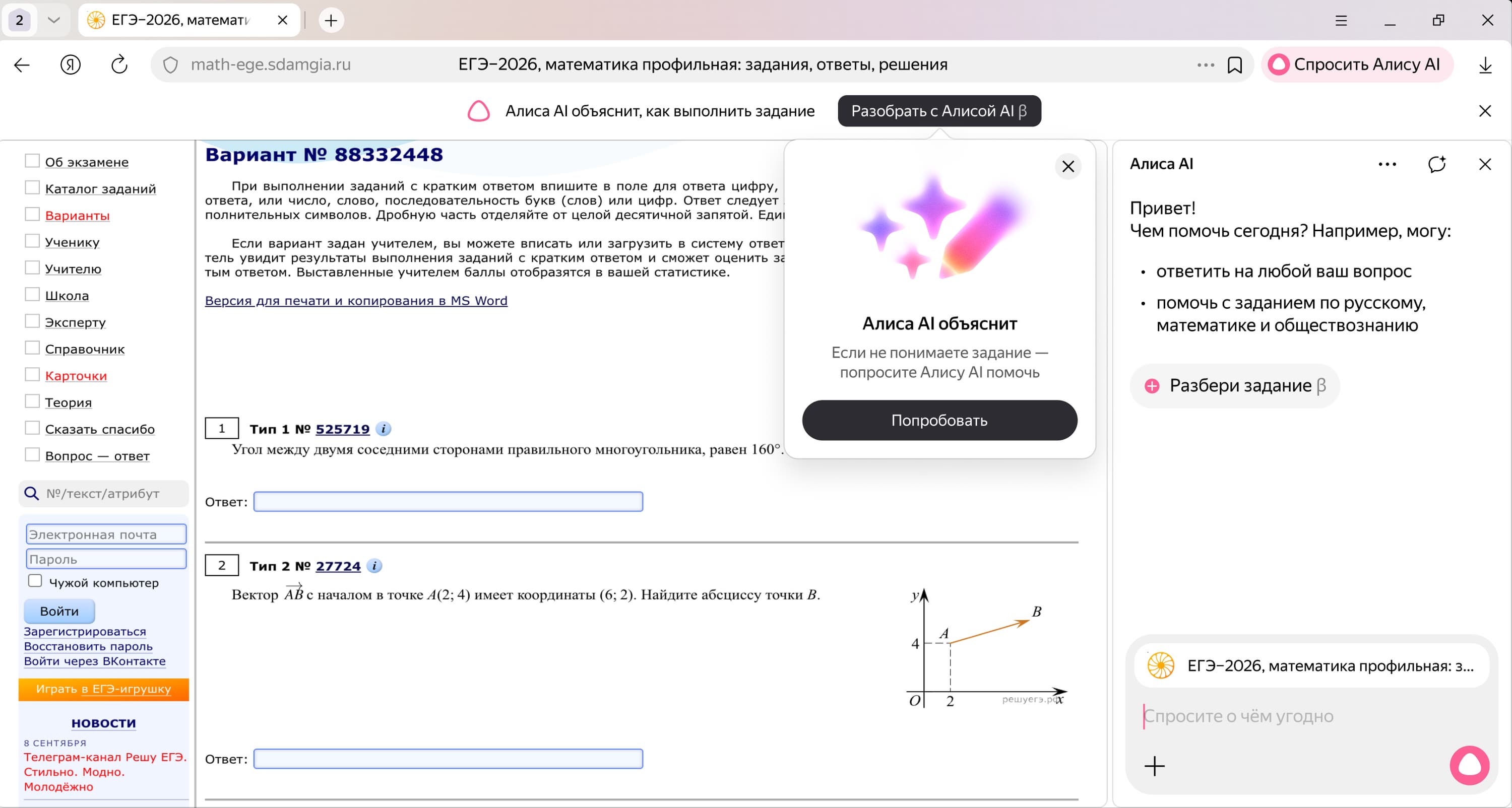«Алиса AI» в «Яндекс Браузере» и приложении «Яндекс с Алисой AI» научилась помогать школьникам готовиться к экзаменам. Нейросеть автоматически распознаёт задания на образовательных сайтах и предлагает их разобрать. В чате «Алиса AI» пошагово объясняет задачи, напоминает теорию и приводит примеры. Об этом сообщила пресс-служба Яндекса.