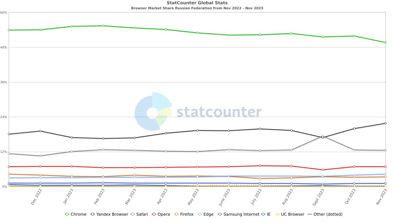 Доля Chrome в России опустилась ниже 50% и продолжает снижаться. Яндекс Браузер растёт