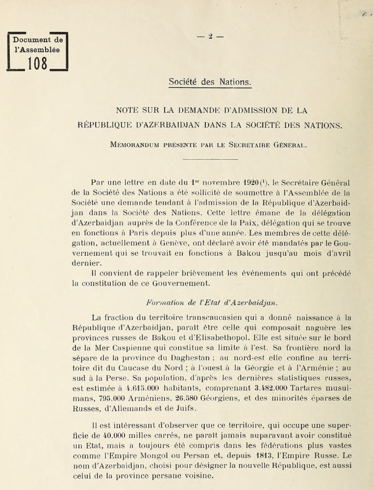 «Il est intéressant d'observer que ce territoire, qui occupe une superficie de 40.000 milles carrés, ne paraît jamais auparavant avoir constitué un État, mais a toujours été compris dans les fédérations plus vastes comme l'Empire Mongol ou Persan et, depuis 1813, l'Empire Russe. Le nom d'Azerbaïdjan, choisi pour désigner la nouvelle République, est aussi celui de la province persane voisine.»