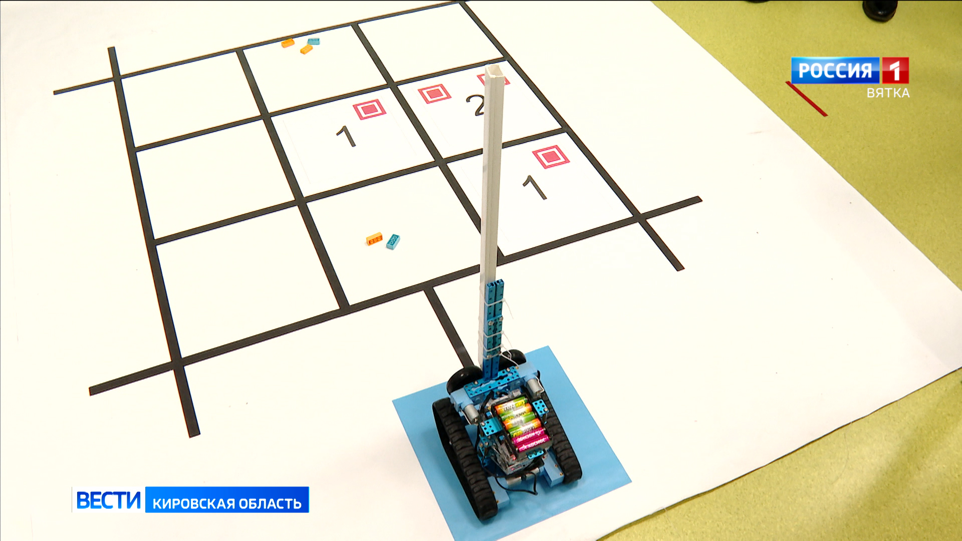 На направлении "Робототехника" участникам необходимо выполнить задание по типу "судоку", на небольшом поле, три на три клетки, расположены цифры и цветовые маркеры, задача ребят запрограммировать своего робота, чтобы тот отсканировал поле и правильно разложил фишки на пустых зонах.