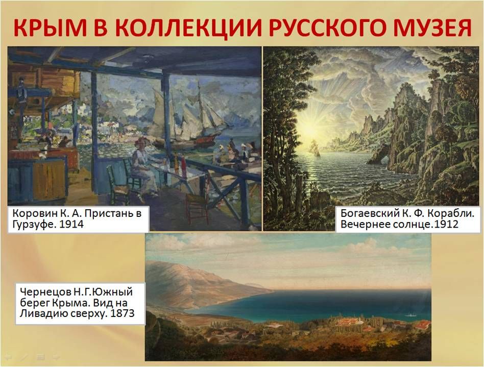 Крымчанам особенно приятно будет узнать, что наш край представлен в живописной экспозиции Русского музея морскими и горными пейзажами, видами Феодосии, Судака, Старого Крыма, Бахчисарая, Севастополя, Гурзуфа и Ливадии (Ялта) в работах Михаила Иванова, Никанора Чернецова, Архипа Куинджи, Василия Поленова, Ивана Айвазовского, Константина Богаевского и Константина Коровина.