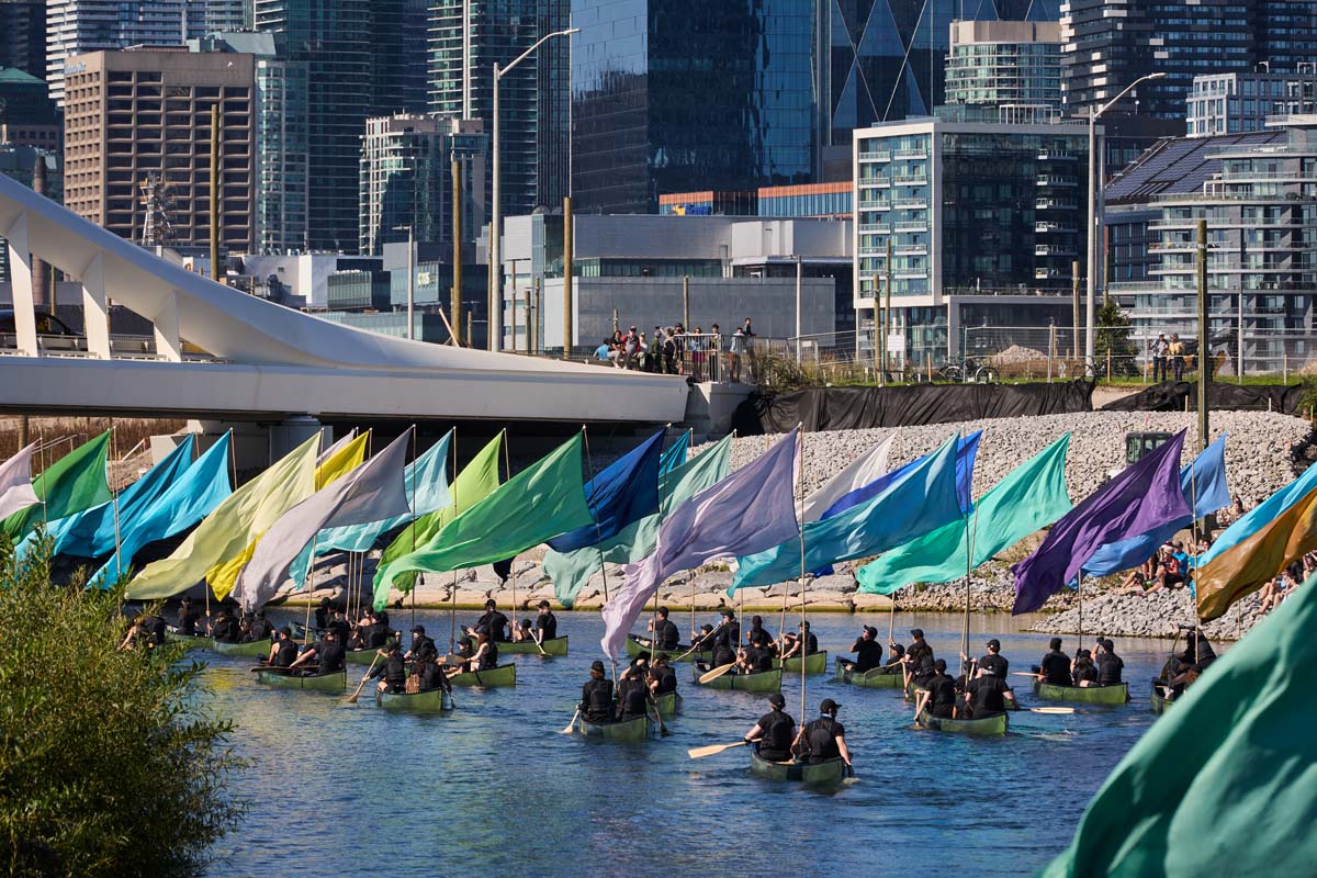 In late September, a flotilla of 120 canoes travelled from the new mouth of Toronto’s Don River at the MVVA-designed Biidaasige Park, heading towards Lake Ontario. The floating procession paddled past the new developments at East Bayfront, looping back at the CCxA-designed Sugar Beach. Each of the canoes bore a large silk flag, dyed with materials gathered from Toronto’s shorelines.