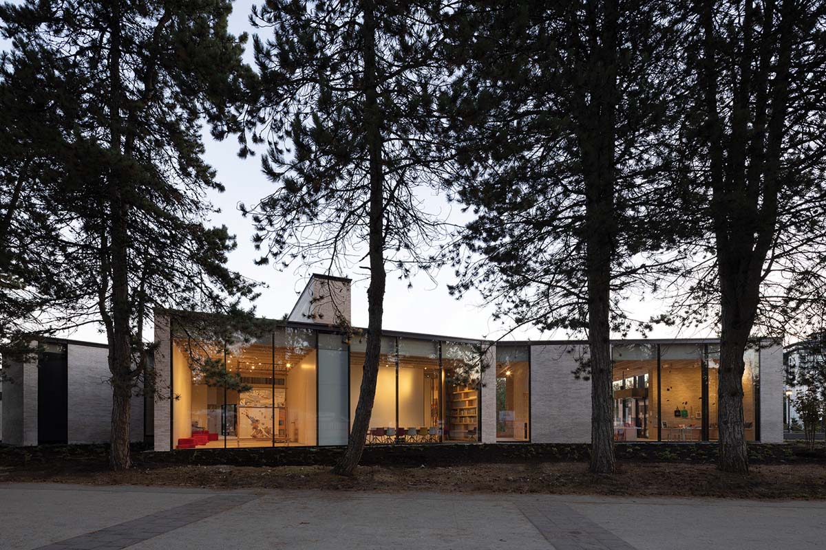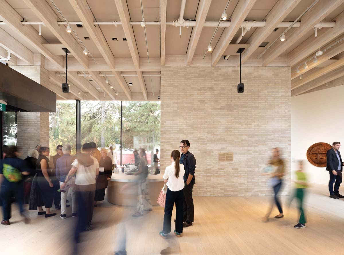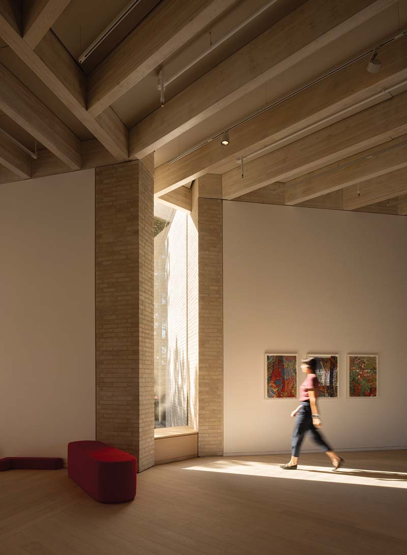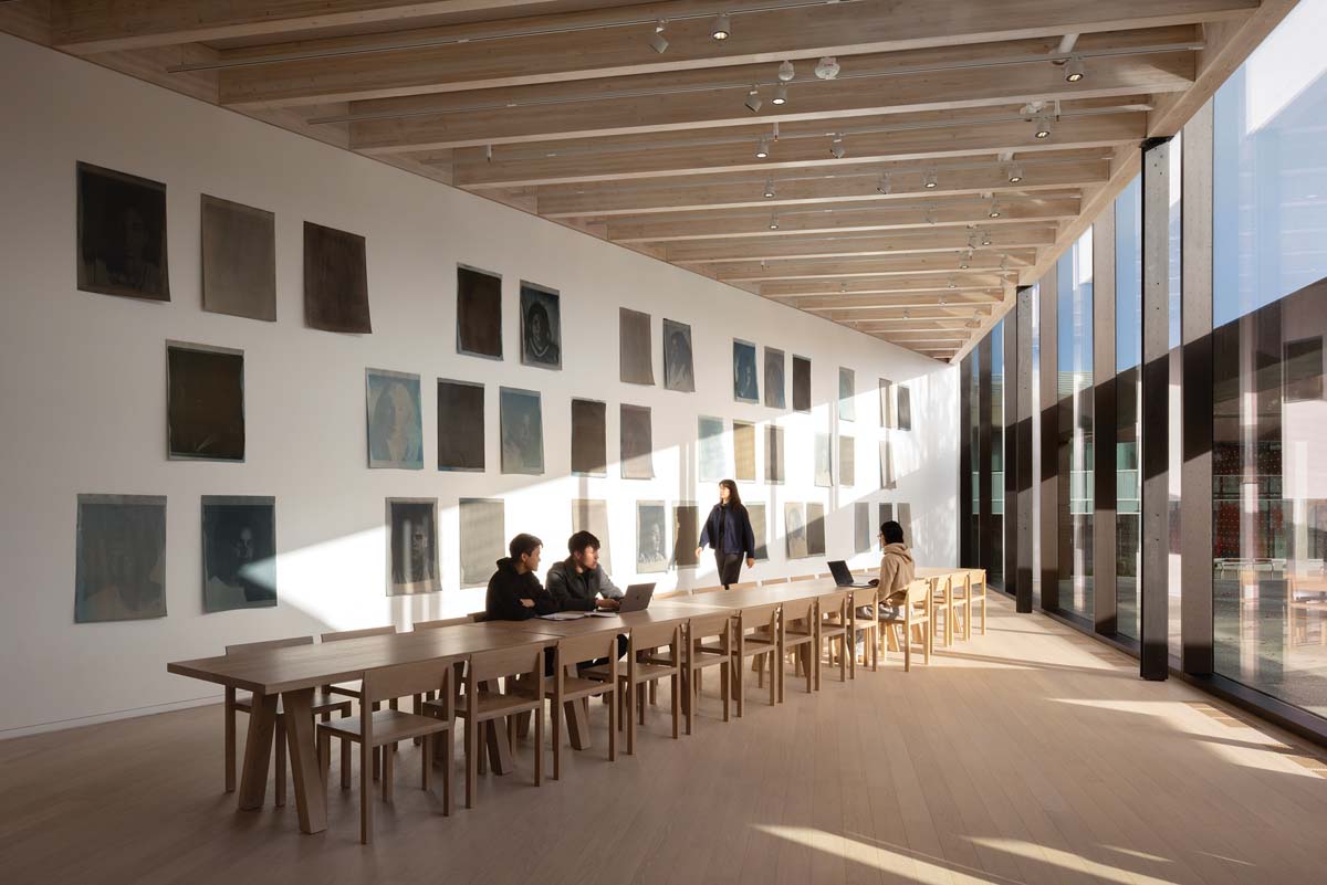 Unlike most museums with a clear single entrance, the main circulation route connects entrances at either end of the building: this is museum-as-promenade. The design approach treats art as an offering rather than an exhortation. Especially on rainy days, students can enter the 1,125-square-metre museum to shelter for part of their walk, or just hang out in one of the two art-filled lounge areas.
