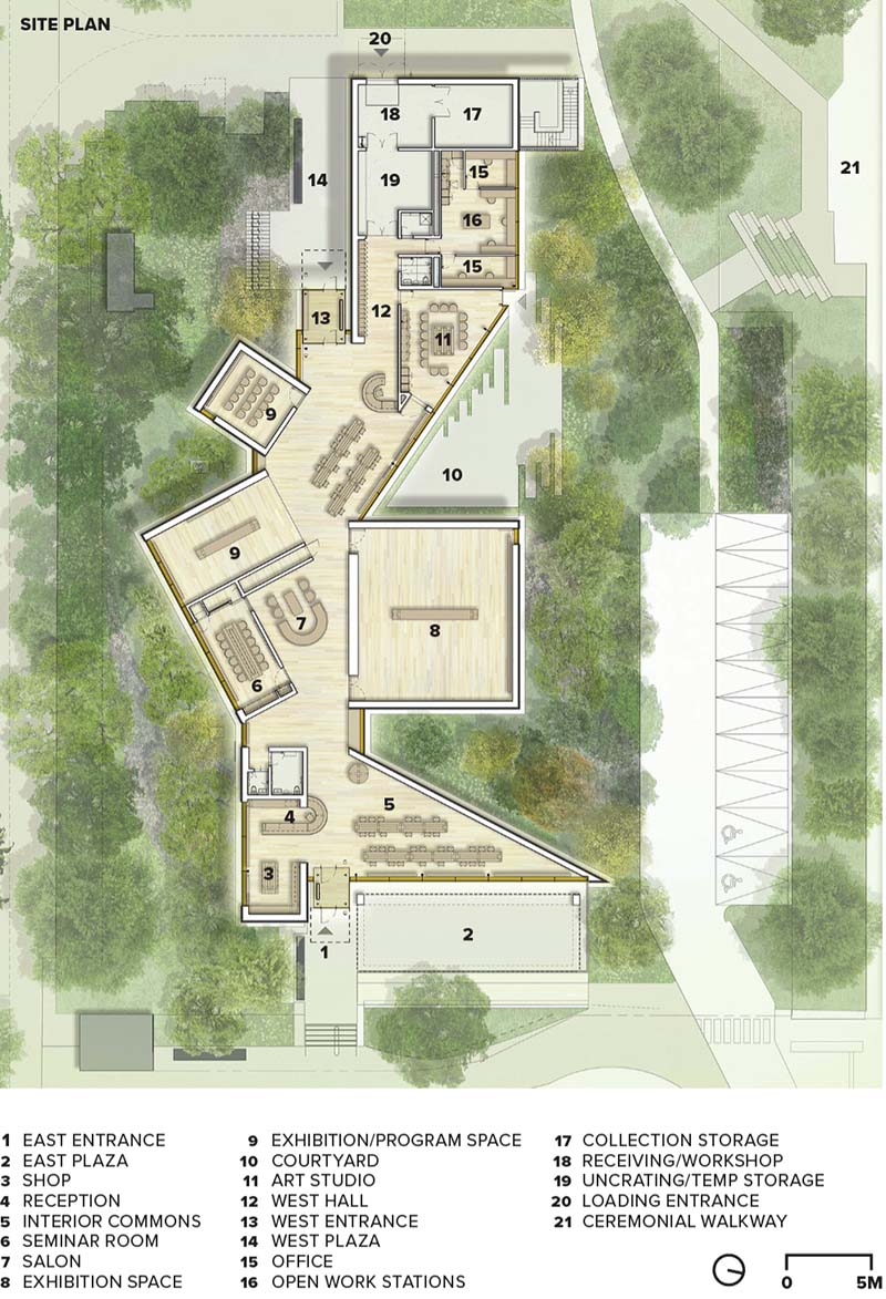 Hariri conceived this project, as others, by imagining and sketching images that suggest trees and primordial geometric forms. In the final plan, the forms create discrete exhibition, research, and lounge spaces inside the building, and nature-framing nooks outside of it.