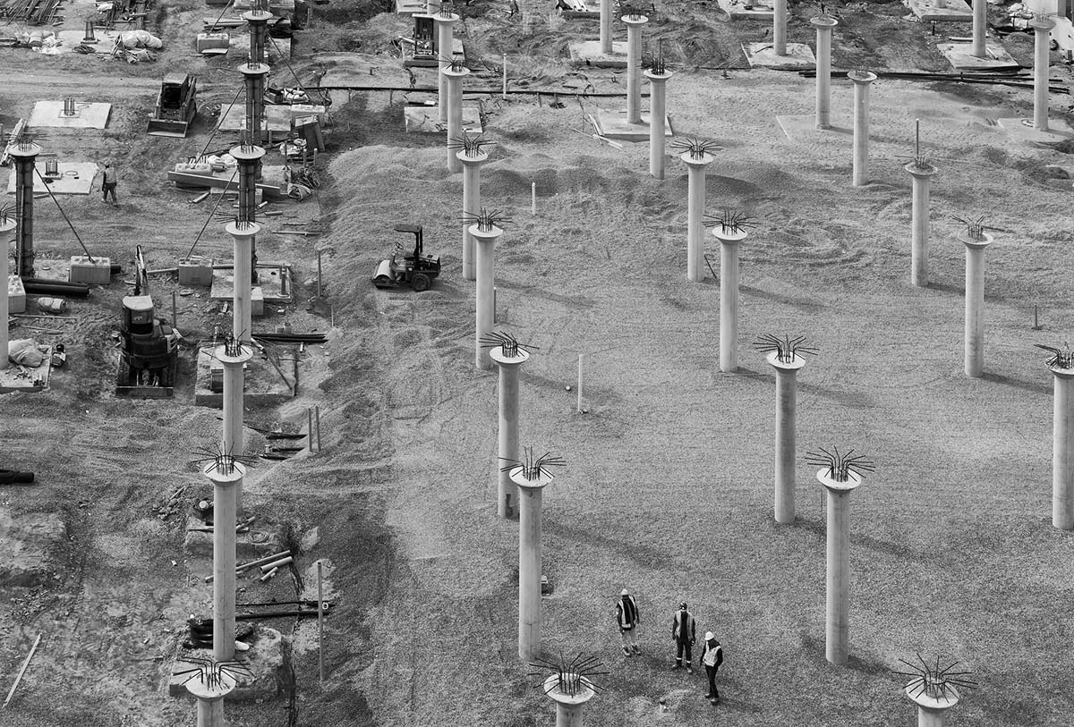 A celebrated University of Toronto Landmark Project construction photo calls to mind a patient on the operating table, viewed from above. Salina Kassam’s image, a 2023 Canadian Architect Photo Award of Excellence winner, captures King’s College Circle, the core of the St. George Campus’s heritage precinct, after 372 boreholes had been drilled to a depth half the height of the CN Tower under the rounded Front Campus lawn to construct a massive geo-exchange system. We see a frame-filling grid of mushroom-capped columns, each topped with a frizz of rebar. These are the roof supports for the 236-car garage that will sit atop the geo-exchange field and nestle under the lawn.