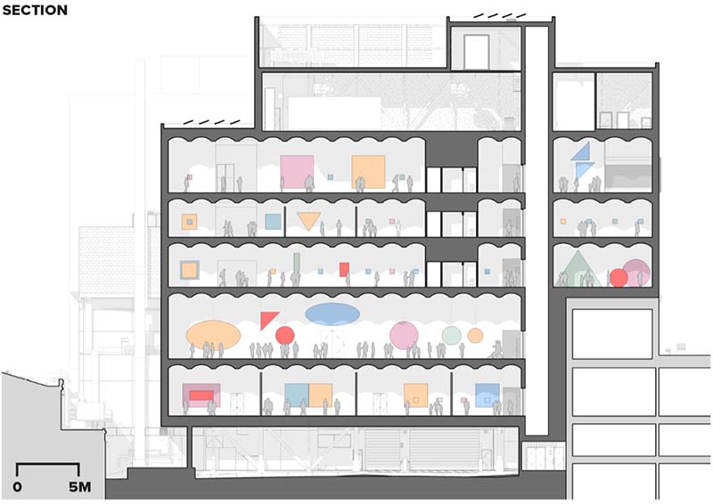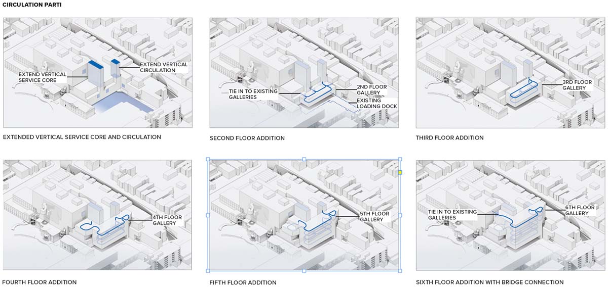 The museum’s mechanical plant is all-electric, and will be built to Passive House standards, with exceptional insulation and minimized thermal bridging. The addition is seeking CAGBC Zero Carbon Building Design certification, which would make it one of a very small number of museum spaces to accomplish this. To achieve significant reductions in its carbon footprint, the design employs low-embodied carbon terracotta cladding and reduced concrete thicknesses in floor slabs and footings, specifies low-carbon concrete and electric arc-furnace structural steel, and includes low-carbon insulation.