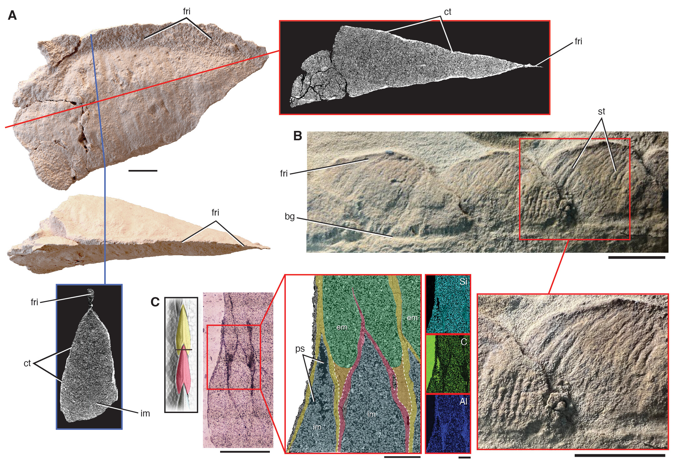 Микроструктура и химический состав отпечатков шипов эдмонтозавра (E. annectens). (A) Шип, относящийся к среднему хвостовому позвонку (CA29), очищенный от окружающей породы. Показаны виды сбоку и сверху, а также поперечные срезы, полученные с помощью компьютерной томографии (КТ). (B) Несколько шипов из середины хвоста (позвонки CA32-34), вид сбоку (изображение отзеркалено). Внизу — увеличенный фрагмент, показывающий, как соседние шипы сцепляются друг с другом. (C) Изображения, полученные с помощью электронного микроскопа. Слева показаны два шипа (CA30 — желтый, CA31 — красный) и место, где был сделан тонкий поперечный срез. В центре — увеличенный вид этого среза. Справа — карты распределения химических элементов, которые подтверждают наличие кремния (Si) и алюминия (Al) и отсутствие углерода (C) в структуре шипов. Это доказывает, что шип состоит из глины, а не из органики. Расшифровка цветов: шип CA30 (желтый), шип CA31 (красный), заполнение между шипами (оранжевый), внешняя порода (зеленый), внутренняя порода (синий).