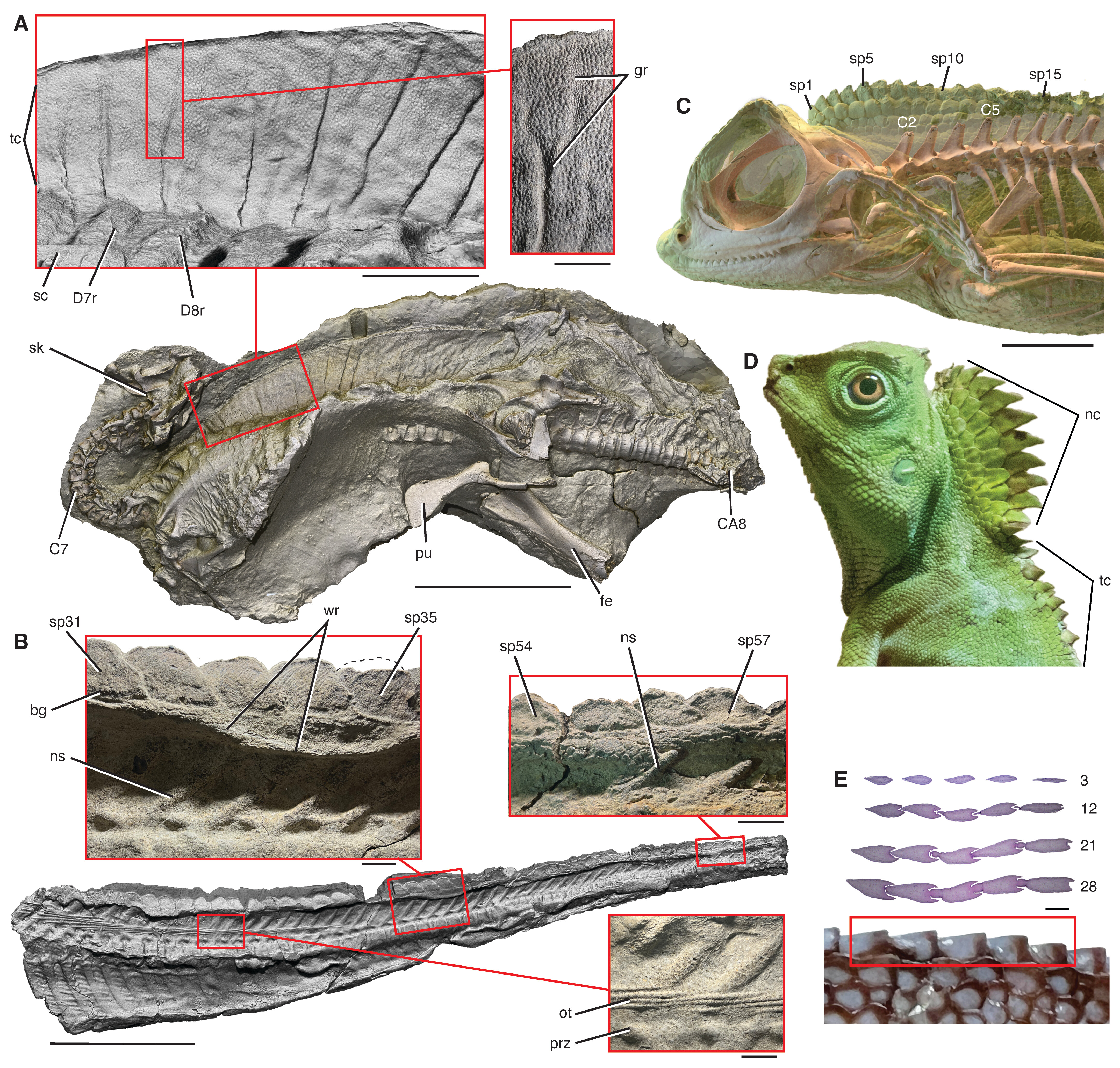 Срединный гребень и ряд шипов у эдмонтозавра (E. annectens) в сравнении с современной ящерицей. (A) Мясистый гребень на туловище молодой особи эдмонтозавра. На вставке крупным планом показана его передняя часть с бороздой, покрытой мелкой чешуей. (B) Ряд шипов на хвосте взрослой особи эдмонтозавра. Вставки показывают сцепленные между собой шипы и высохшую чешуйчатую кожу, обтягивающую позвонки и сухожилия (изображение отзеркалено). (C) Прозрачный вид головы углоголовой ящерицы (Gonocephalus doriae). Он показывает, что внешние шипы на шее не связаны напрямую с отростками шейных позвонков. (D) Высокий шейный гребень у родственного вида ящерицы (G. chamaeleontinus). (E) Тонкие срезы, показывающие, как шипы углоголовой ящерицы сцепляются между собой. Цитирование: Paul C. Sereno et al., Duck-billed dinosaur fleshy midline and hooves reveal terrestrial clay-template «mummification».Science0,DOI:10.1126/science.adw3536