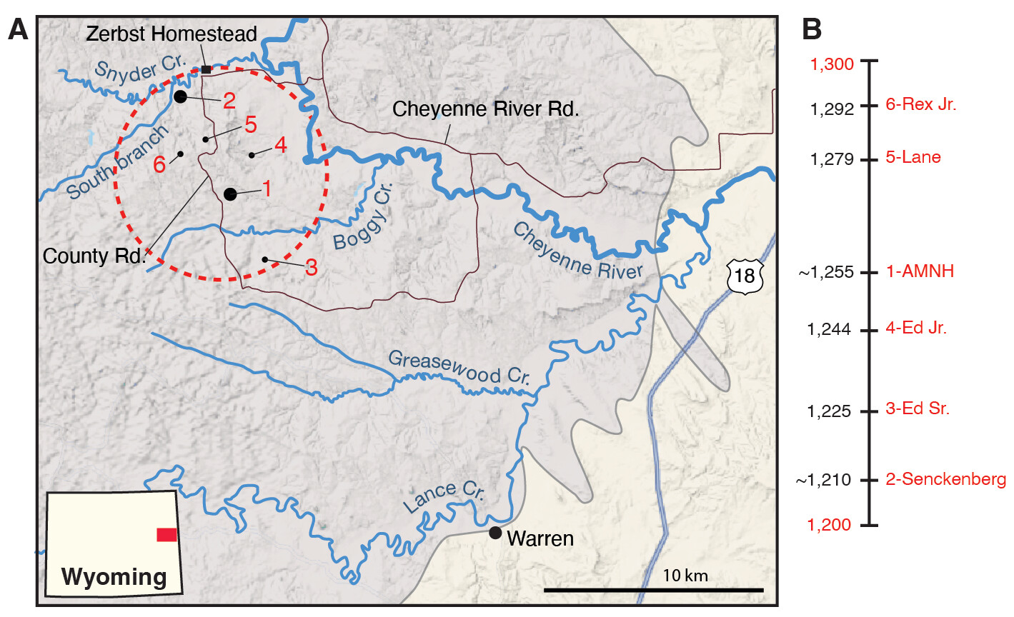 «Зона мумий» динозавров в формации Лэнс на востоке центральной части штата Вайоминг. (A) Карта местности, показывающая так называемую «зону мумий» (отмечена красным кругом диаметром 10 км). Указаны местоположения и примерная высота залегания двух мумий эдмонтозавра, найденных более ста лет назад (номера 1, 2), и еще четырех мумий, обнаруженных за последние 25 лет (номера 3-6). Среди недавних находок есть не только эдмонтозавры, но и трицератопс (Triceratops horridus) и тираннозавр (Tyrannosaurus rex). На карте показана формация Лэнс (серого цвета), относящаяся к самому концу мелового периода (69-66,5 млн лет назад), и подстилающая ее формация Фокс-Хиллс (янтарного цвета). (B) Диаграмма справа показывает, что все шесть мумий были найдены в верхних 100 метрах формации Лэнс. Это говорит о том, что все они жили в очень близкое время, прямо перед массовым вымиранием динозавров.