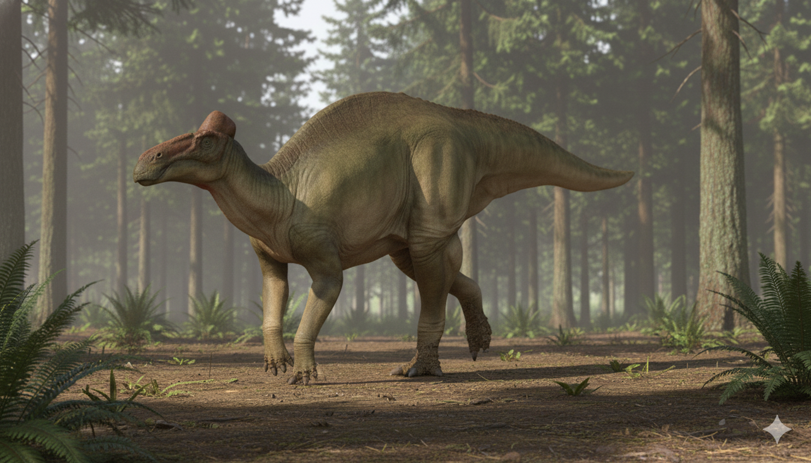 Цветная визуализация приближенного к реальному облика Edmontosaurus annectens, созданная нейросетью Nano Banana на основе данных исследования Paul C. Sereno et al. Цвета приближенные, допустимы артефакты генерации