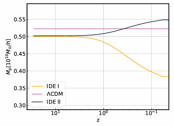 - IDE I: Темная материя распадается и превращается в темную энергию. Масса частиц темной материи со временем уменьшается.