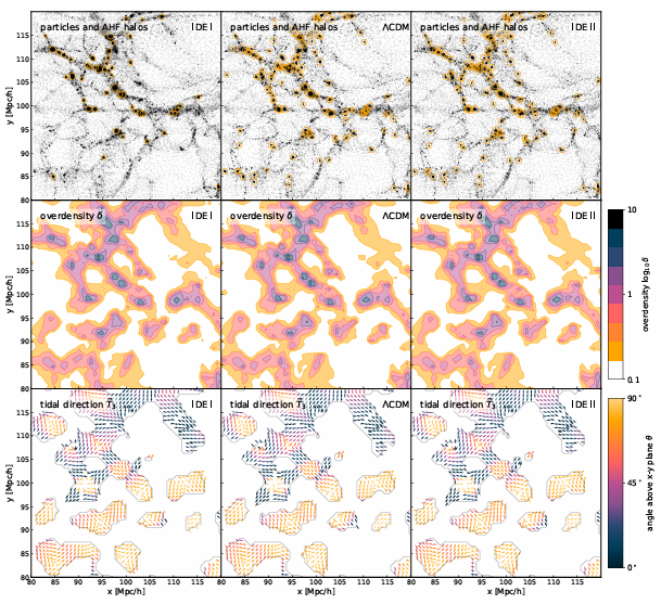 В модели IDE I (где материя исчезает): Гало теряют массу. Их гравитационная связь ослабевает. Они становятся менее плотными и более «рыхлыми». Из-за этого приливные силы окружающей Вселенной легче деформируют их. Результат: форма гало сильнее вытягивается вдоль линий приливного поля. Однако их вращение (спин) при этом стремится быть перпендикулярным этому полю.