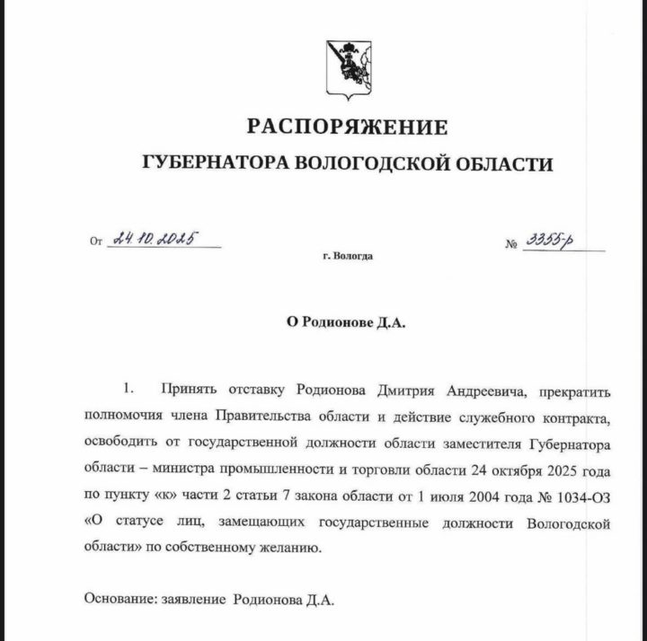 Вице-премьер правительства Карелии (2017—2025) Дмитрий Родионов, работавший с марта 2025 года заместителем губернатора Вологодской области, покинул пост. Чиновник написал заявление 24 октября.
